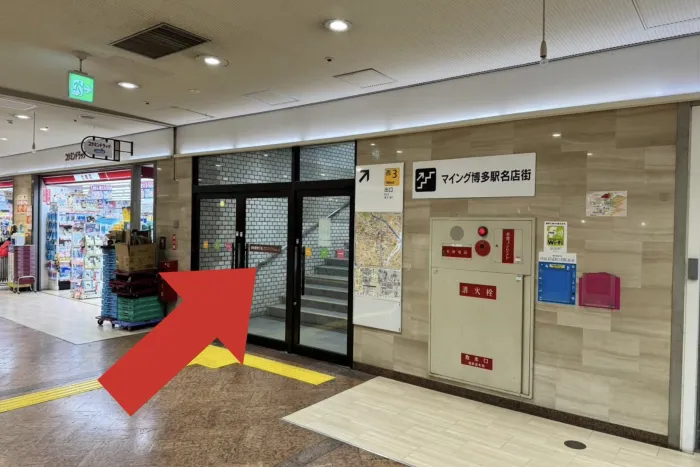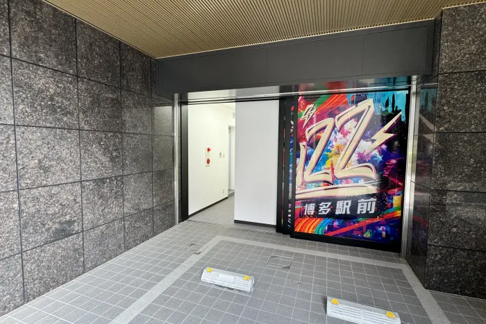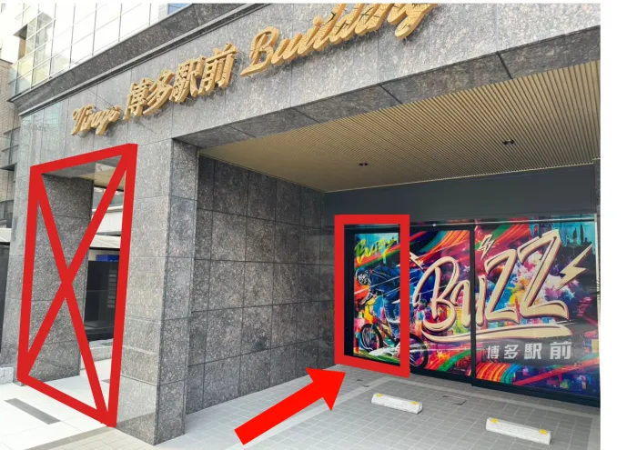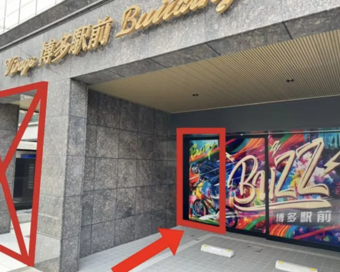 「BUZZ博多駅前」のラッピングがしてある自動ドアが入り口