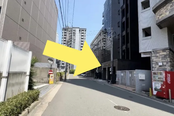 黄色矢印の建物が目的地