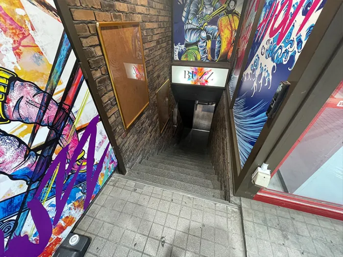 交差点から10m程進むと右手にアドアーズがあります。こちらのビル地下一階がBUZZ八王子店です。