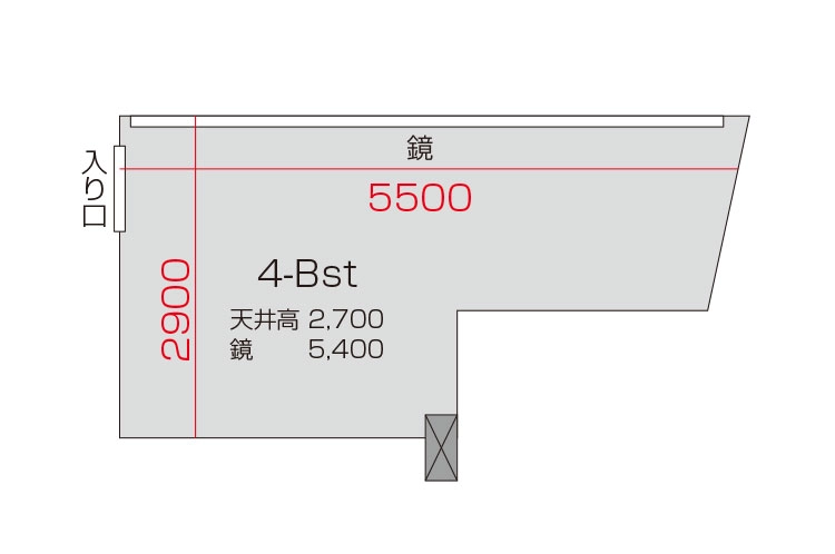鏡面5.4mで、3〜5名ほどの少人数レッスンに最適です。