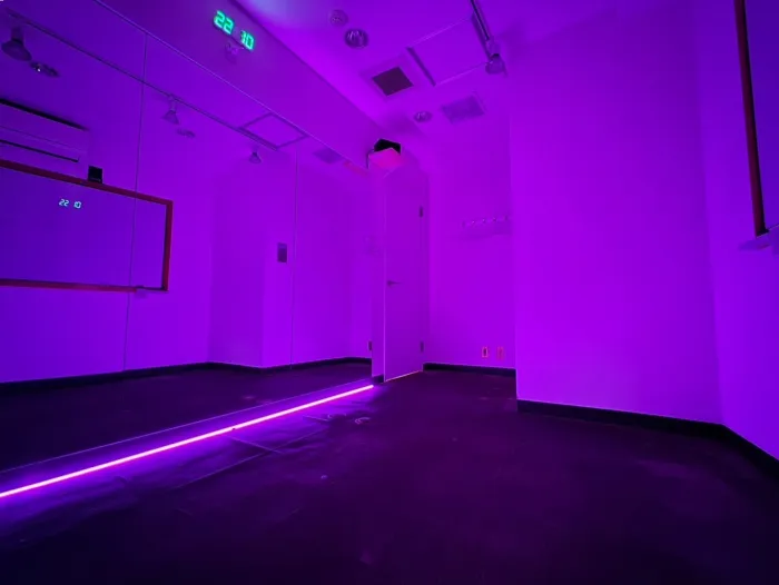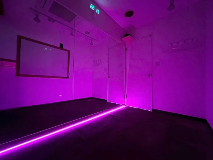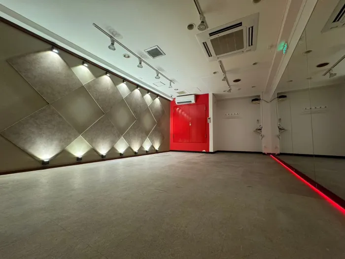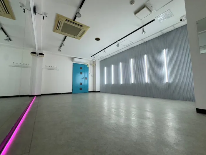 【ストリート風内装デザイン】 トタン風壁×LEDライトバーで、 あらたな「ストリート風」のデザインのスタジオが誕生! コンセプトに合わせたこだわりのダンス動画が撮影してみませんか? 明るい状態・LEDのみの状態、其々また違った雰囲気で楽しむことができます♪ 10~15名での利用可 レッスンにおすすめの中型スタジオです!