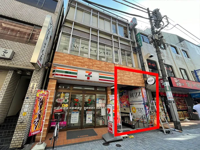 西口商店街を徒歩約2分まっすぐ進むと、左手に1階がセブンイレブンのビルがあります。地下1階がスタジオBUZZ神田店です セブンイレブン右手の地下へ降りる階段からお入りください JR神田駅 西口(大手町方面口)を出る