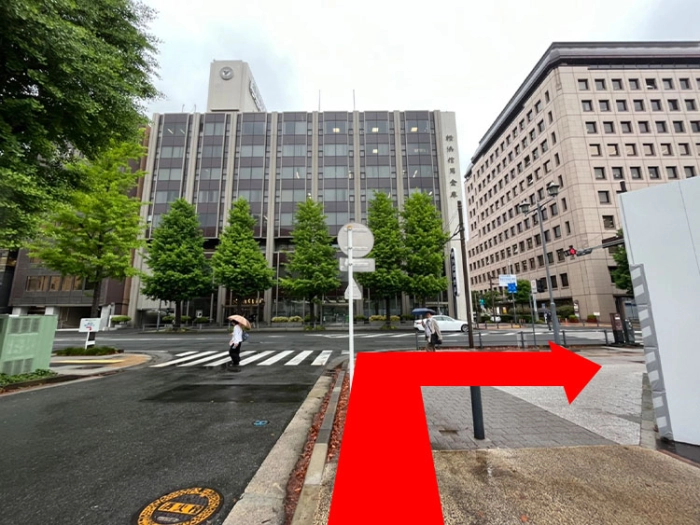 曲がった先にある、奥の方の横断歩道を渡りベイスターズ通りを真っ直ぐ5分ほど進む。