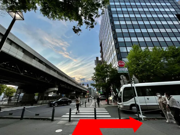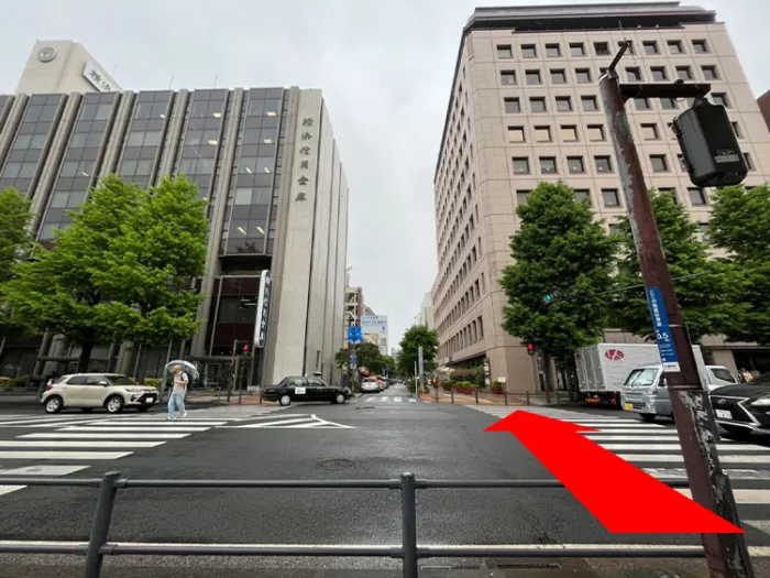 曲がった先にある、奥の方の横断歩道を渡りベイスターズ通りを真っ直ぐ5分ほど進む。