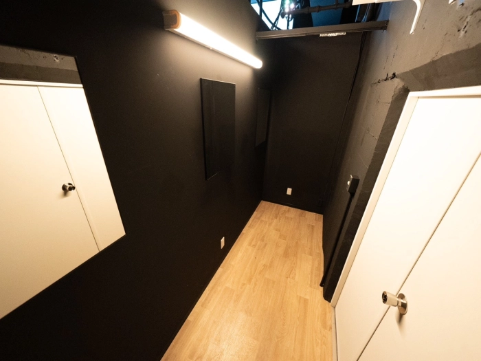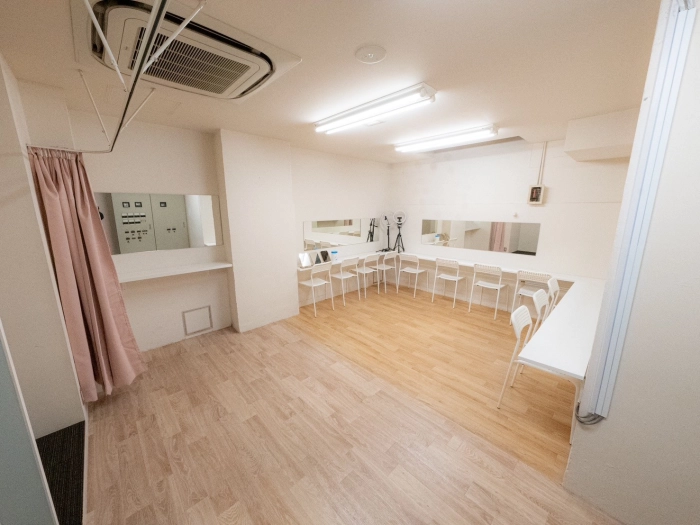 更衣室完備 完全防音 大型スピーカー ◆ライトニング/ステレオミニプラグ対応 女性専用更衣室 楽器利用可 リノリウム マイク マイクスタンド 大型モニター 長机 丸椅子 LED照明 専用トイレ