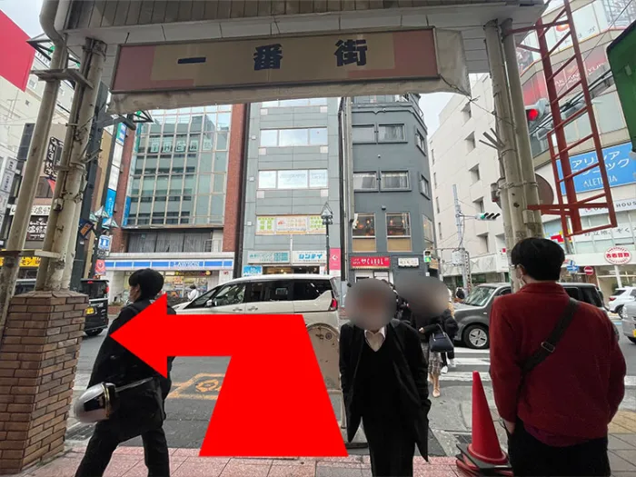 2分程歩いた先を右折。一番街に入りまっすぐ進む。