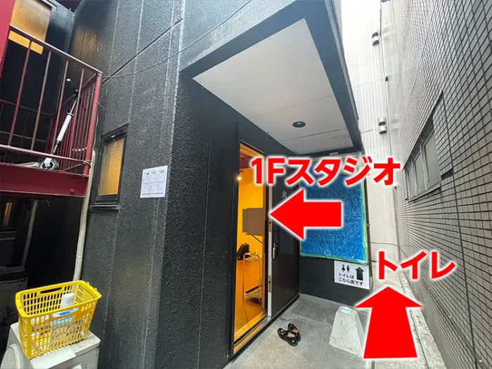 御手洗は外にあります。1Fスタジオ入口のさらに奥です。