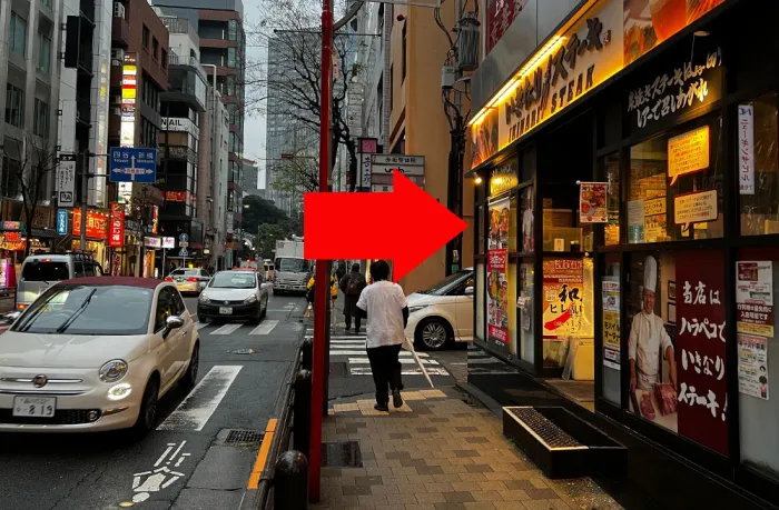 「いきなりステーキ」が見えてきます。そのまま信号を渡ってください。