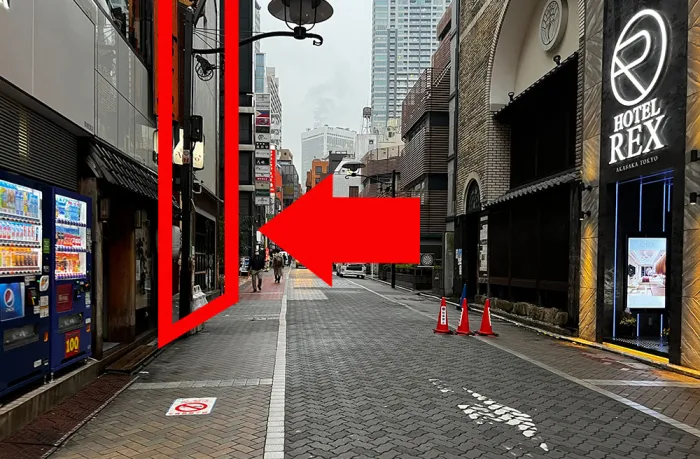 信号を渡ると右手に「HOTEL REX」が見えます。このホテルの斜め向かいのレンガの建物がバズスタが入っているビルです。
