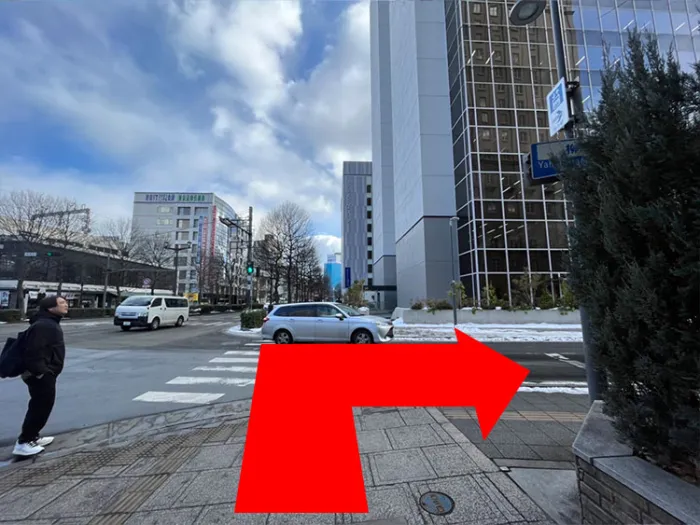 階段降りて進み、1つ目の横断歩道のまで来たら横断歩道を渡らず右に曲がる。