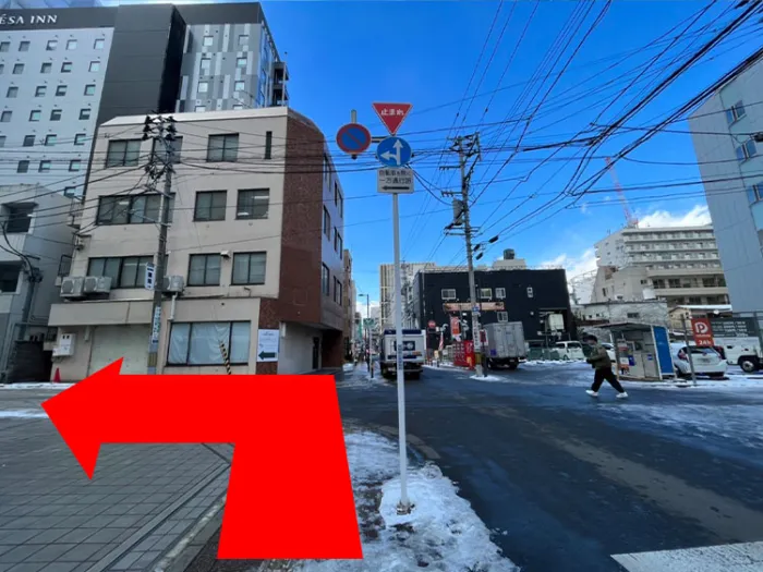 1つ目の十字路を左に曲がるとすぐに見える建物の地下1階がBUZZ仙台駅前になります。