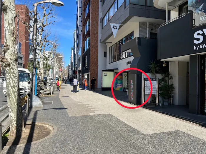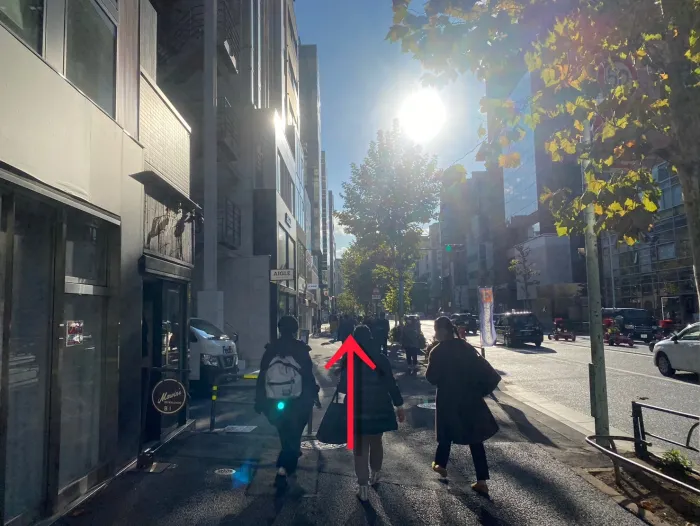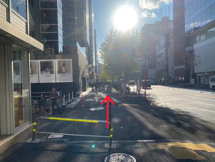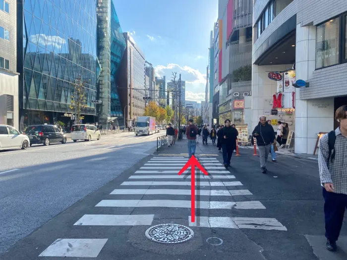 地上に出たら目の前の横断歩道を渡り、そのまま直進します。