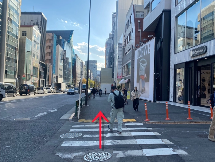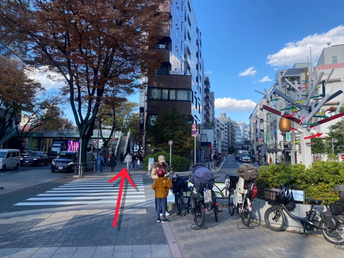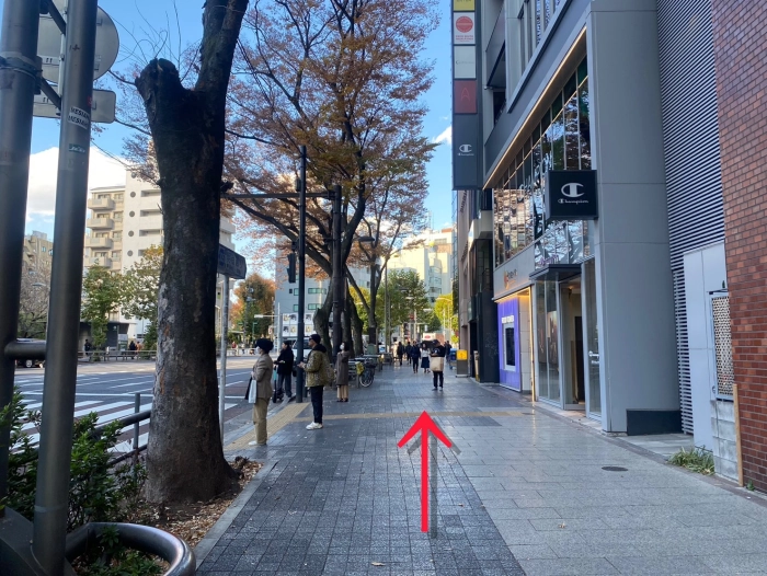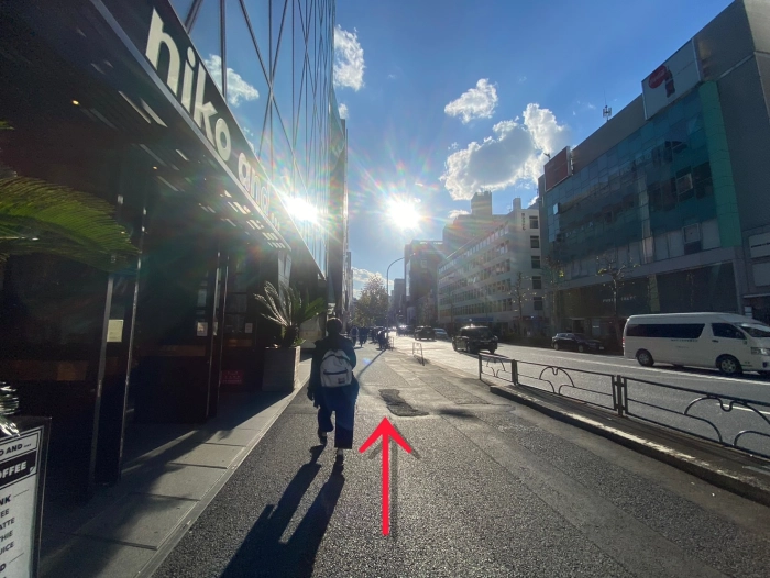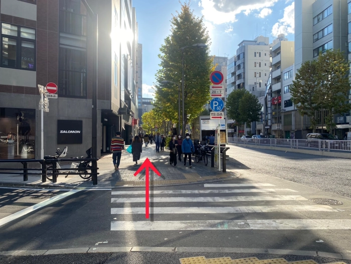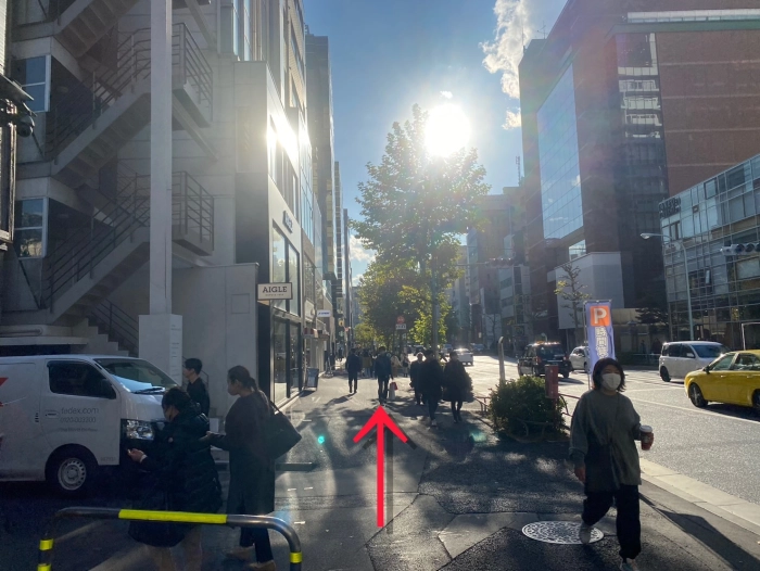 地上に出たら目の前の横断歩道を渡り、そのまま直進します。