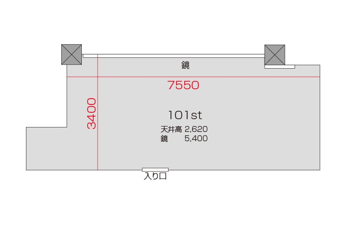 広さ 25.5㎡ 天井高 2.62m 鏡 5.4m