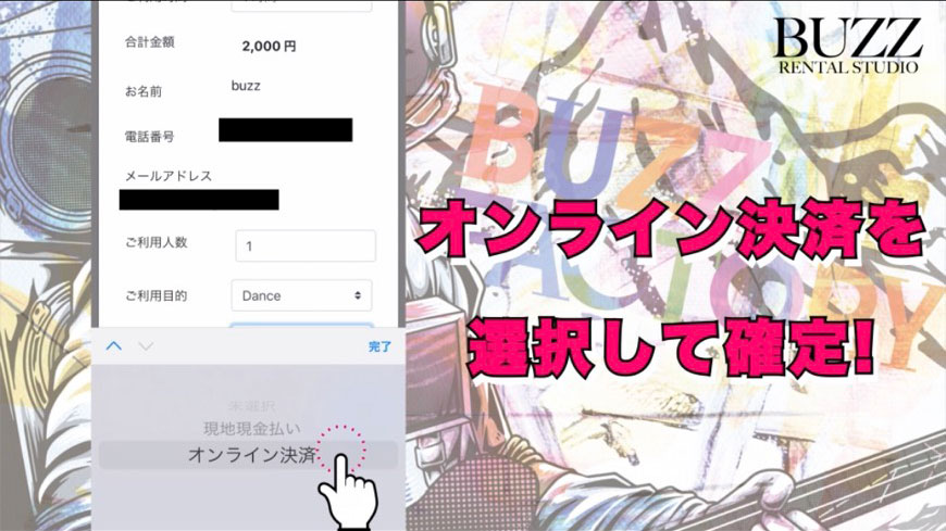 ご利用時間、人数などを入力したら「お支払い方法」で【オンライン決済】を選択。最後に【確定】をタップ。